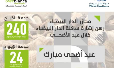 أعلنت شركة التنمية المحلية الدار البيضاء للخدمات، أمس الإثنين، أنها ستقوم بتوفير خدمة ذبح أضحية العيد بالمجازر الحضرية للدار البيضاء الكائنة بـشارع 10 مارس سيدي عثمان....