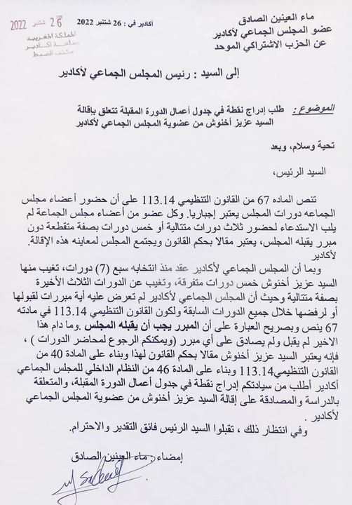 وجّه المستشار ماء العينين الصادق، العضو بالمجلس الجماعي لمدينة أگادير، يوم الاثنين الماضي، 26 شتنبر 2022، طلبا إلى عزيز أخنوش، رئيس الحكومة، بصفته رئيسًا للمجلس الجماعي لأگادير، يلتمس فيه إدراج نقطة في جدول أعمال الدورة المقبلة تتعلّق بـ”طرد” عزيز أخنوش نفسه من عضوية هذا المجلس، بسبب غيابه المتكرر عن حضور دورات المجلس.