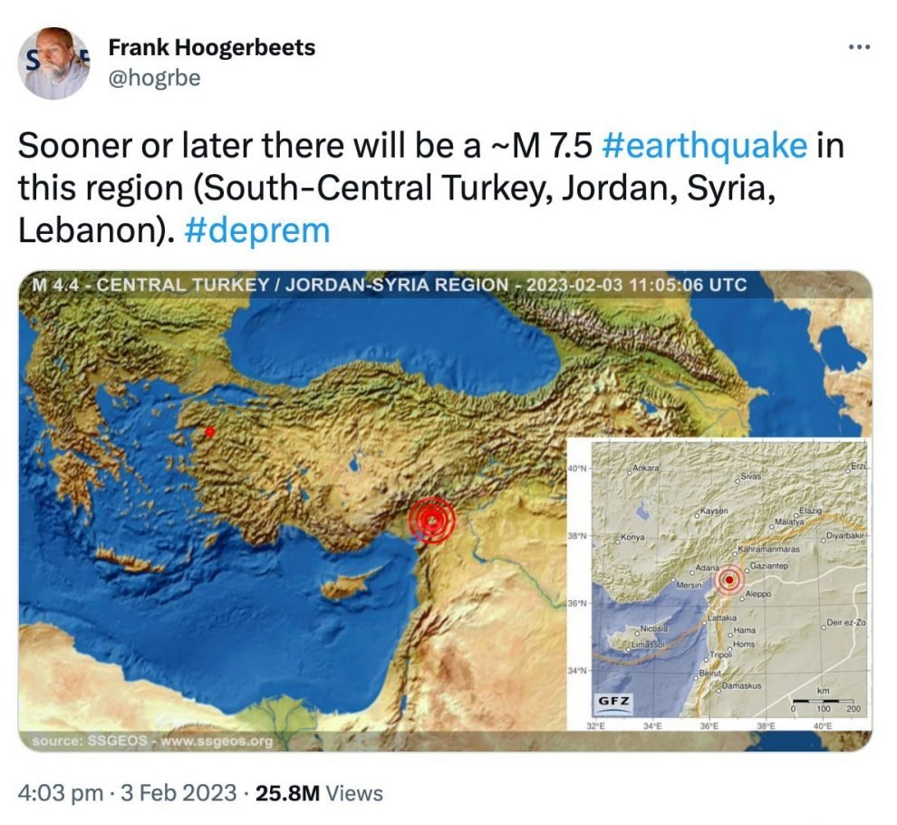 وقد نشر هوغيربيتس، تغريدة عبر حسابه الشخصي، يتوقع خلالها حدوث زلزال تركيا المدمر، قبل وقوعه بـ 3 أيام، مشيراً إلى الدول التى سيضربها الزلزال والدول التى ستتأثر به، حيث توقع أن هناك زلزال سيحدث بقوة 7.5 درجة مئوية في منطقة (جنوب وسط تركيا والأردن وسوريا ولبنان).
