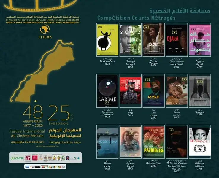 سيشارك 15 فيلما في المسابقة الرسمية للأفلام القصيرة، وذلك ضمن فعاليات الدورة 25 للمهرجان الدولي للسينما الافريقية بخريبكة، والمقامة تحت الرعاية السامية لصاحب الجلالة الملك محمد السادس من 21 الى 28 يونيو 2025.
