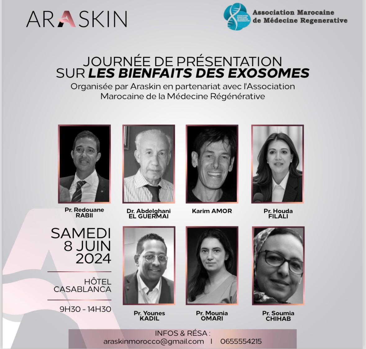 تنظم الجمعية المغربية للطب التجديدي AMMR وبشراكة مع شركة أراسكين **Araskin** الشركة المختصة في توزيع منتجات الطب التجميلي والتجديدي في المغرب ، ندوة علمية هامة حول ” العلاج بالاكسوزوم Exosome ومستقبل الطب التجديدي بالمغرب ” وذلك يوم السبت 8 يونيو 2024 بمدينة الدارالبيضاء .