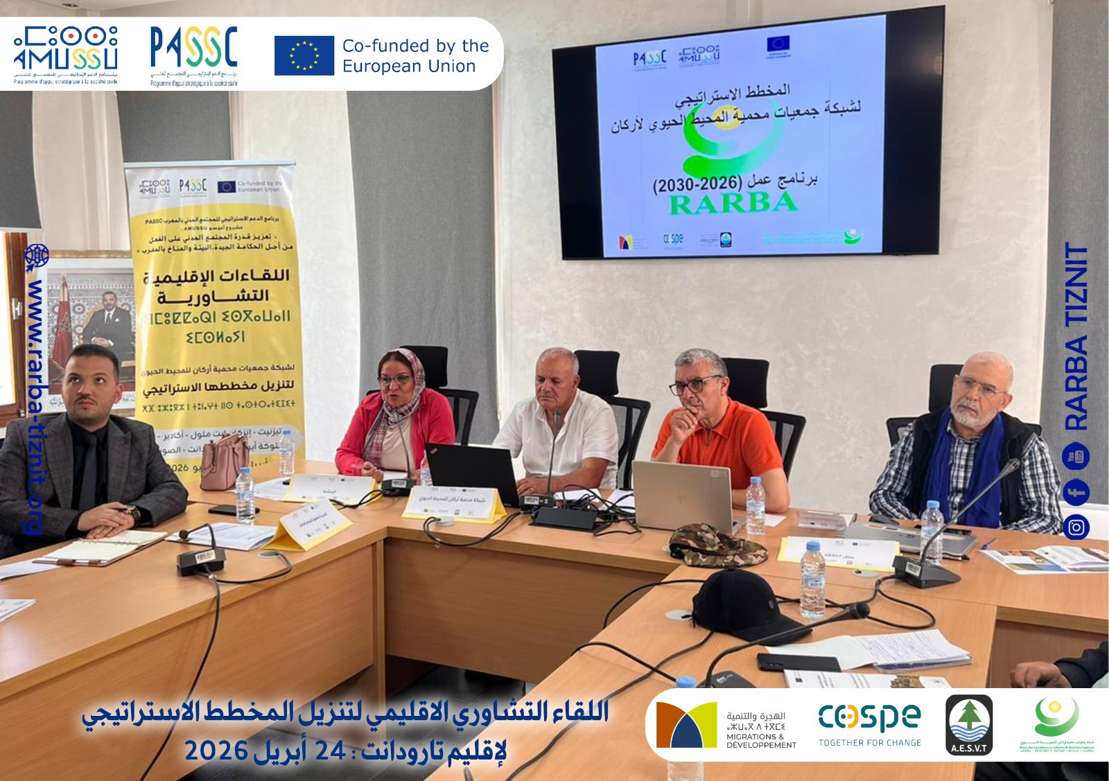 في إطار تنزيل مخططها الاستراتيجي للفترة 2026-2030، لشبكة جمعيات محمية أركان للمحيط الحيوي، أنطلق، صباح اليوم الجمعة 24 أبريل 2026 بمدينة تارودانت، لقاءً تشاورياً تكوينياً بحضور ممثلي الجمعيات والتعاونيات وممثلي القطاع ذات الصلة بمحمية أركان، وذلك في إطار مشروع AMUSSU: «تعزيز قدرة المجتمع المدني بالمغرب على الفعل من أجل الحكامة الجيدة والبيئة والمناخ»، و المندرج ضمن برنامج الدعم الاستراتيجي للمجتمع المدني بالمغرب (PASSC)، الممول من طرف الاتحاد الأوروبي والذي يشرف عليه ائتلاف مدني يضم منظمة الهجرة والتنمية (M&D)، وجمعية مدرسي علوم الحياة والأرض (AESVT)، ومنظمة التعاون من أجل تنمية البلدان الناشئة (COSP) .