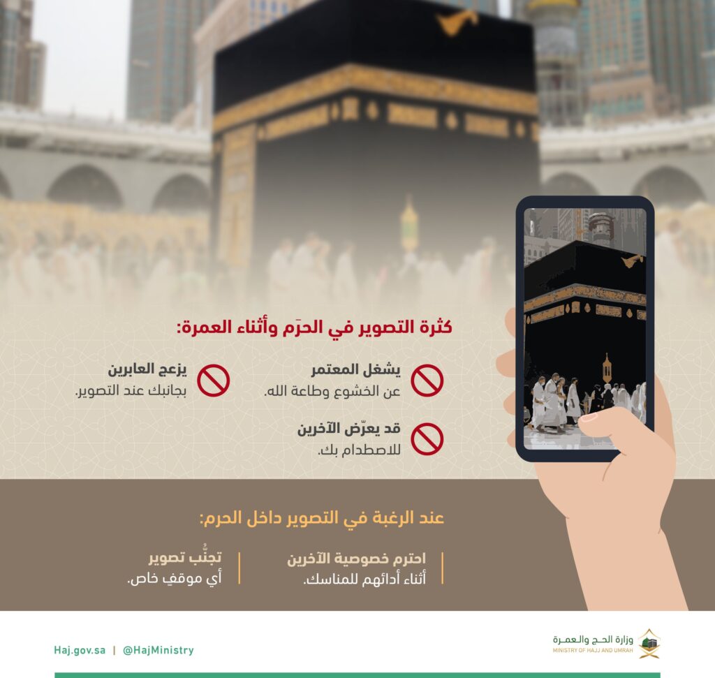 و نبهت وزارة الحج و العمرة السعودية، على انه عند الرغبة في التصوير داخل الحرم يجب تجنب تصوير المواقف الخاصة ، و كذلك يجب احترام خصوصية الآخرين اثناء أدائهم للمناسك .