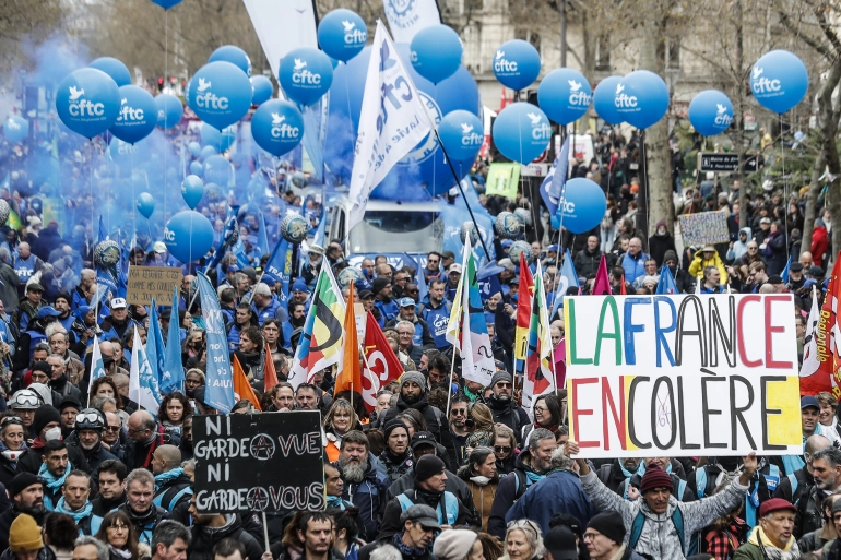 ومنذ يناير، خرج مئات الآلاف من الفرنسيين في مسيرات على مدى عدة أسابيع ضد الإصلاح المذكور، تخللتها أحيانا اشتباكات وأعمال عنف، حتى الحلقة الأخيرة يوم الجمعة الماضي مع مصادقة المجلس الدستوري على النص ونشره في الجريدة الرسمية.
