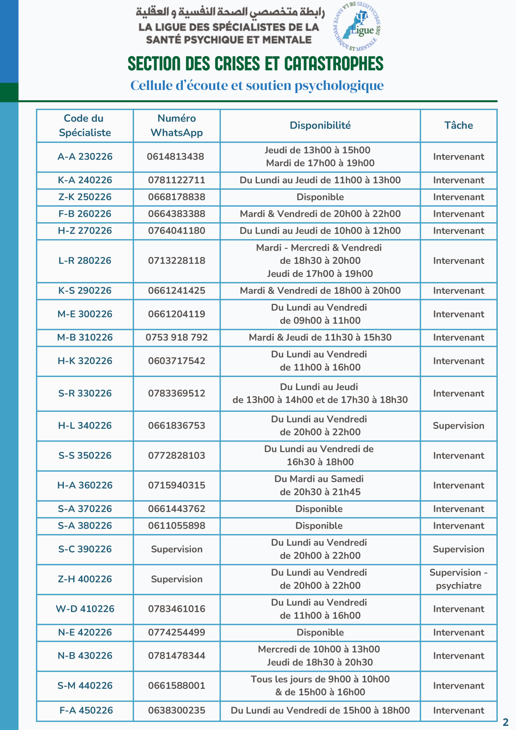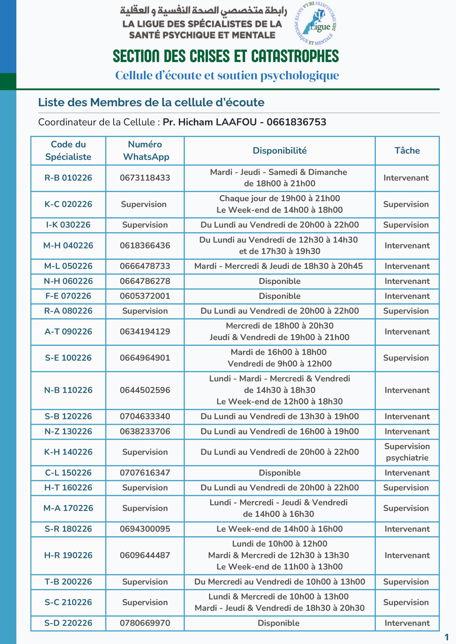 وفي هذا الإطار، قامت الرابطة، بإعداد لائحة خاصة بأرقام هاتفية مخصصة، تُمكّن الساكنة المعنية من التواصل المباشر مع خلية الإنصات والاستفادة من فضاء للاستقبال والإنصات والدعم النفسي، مع احترام مبادئ السرية وأخلاقيات الممارسة المهنية.