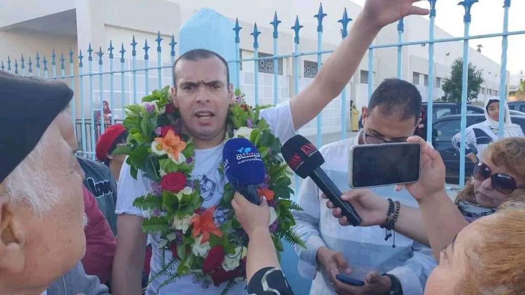 وكان في استقبال، العواج أمام السجن، جمع من الحقوقيين والمتضامنين مع قضيته، فضلا عن أفراد من أسرته ، حيث تم ترديد شعارات تصر على مواصلة النضال من أجل “ننيل الحقوق كاملة و غير منقوصة”، على حد تعبير المستقبلين الذين تجمهروا أمام بوابة السجن .