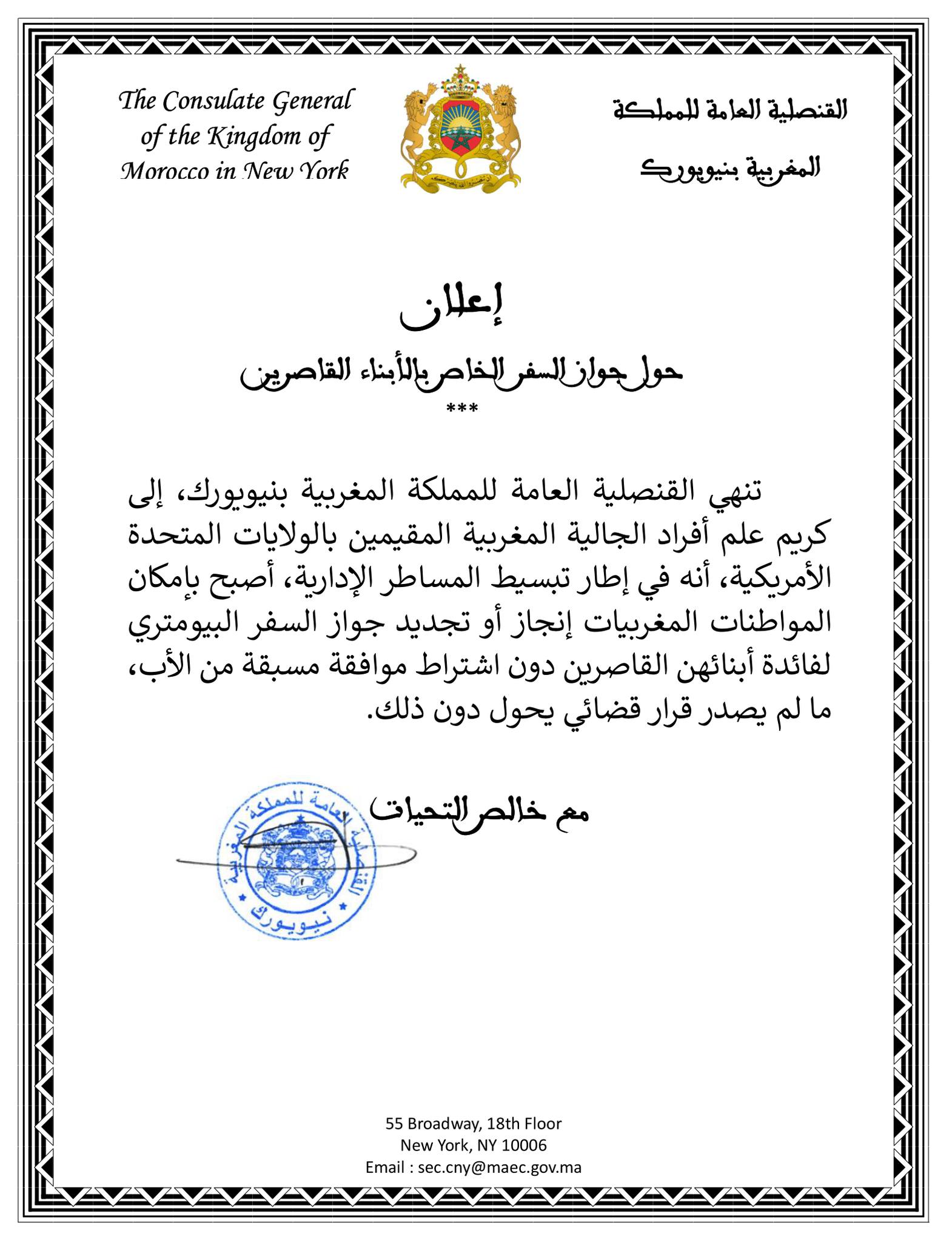 السماح للمغربيات المقيمات بالخارج بتجديد وإنجاز جواز سفر أبنائهن القاصرين بدونَ شرط موافقة الأب