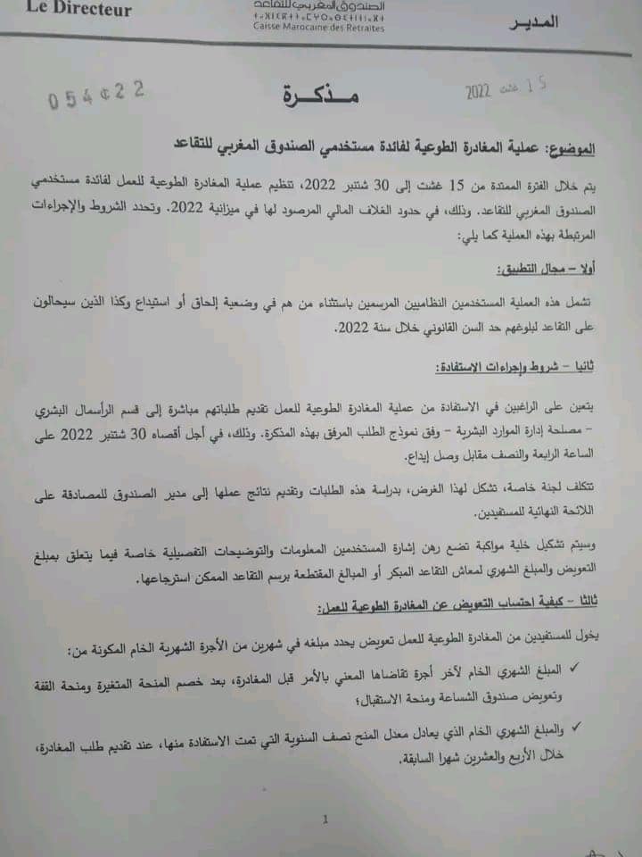 أعلن الصندوق المغربي للتقاعد، عن فتح باب المغادرة الطوعية، من جديد، أمام مستخدميه.