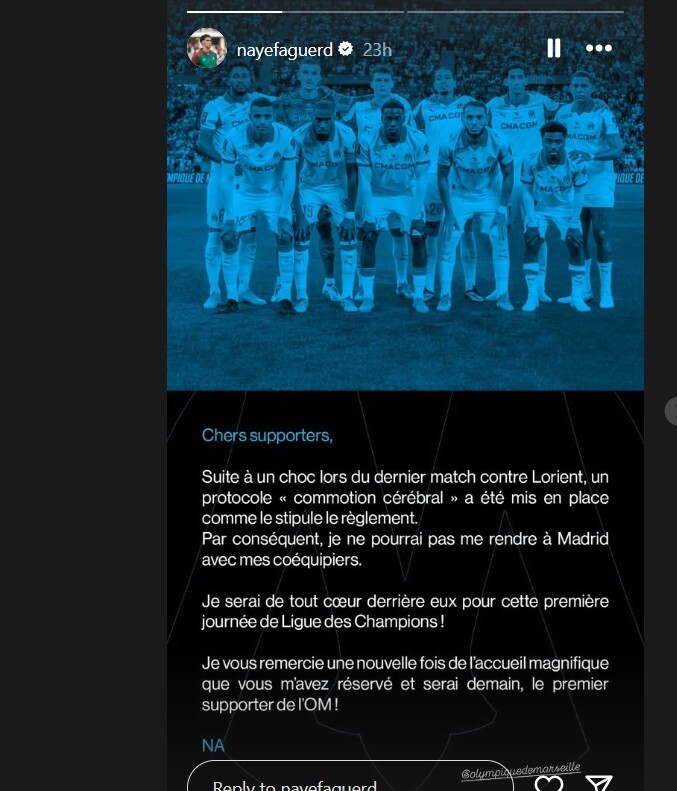 الخبر تم تأكيده من طرف الدولي المغربي، عبر حسابه الرسمي على “إنستغرام”، حيث كتب رسالة من ضمن ما جاء فيها : “بعد تعرضي لاصطدام في المباراة الأخيرة ضد لوريان، تم تطبيق بروتوكول الارتجاج في المخ كما تنص عليه القوانين. وبسبب ذلك، لن أتمكن من السفر إلى مدريد مع زملائي. سأكون بقلبي معهم في هذه الجولة الأولى من دوري أبطال أوروبا!”.