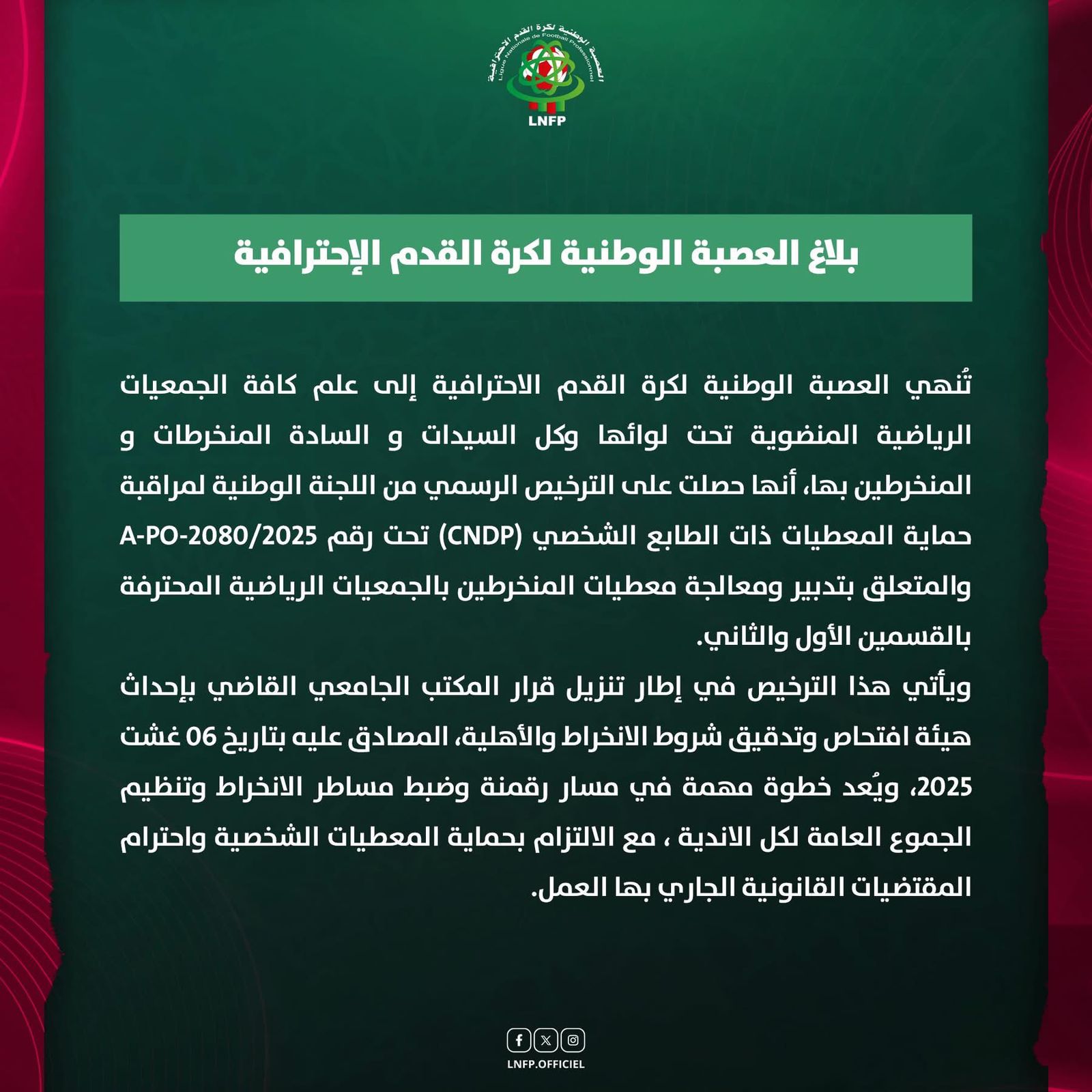 أصدرت العصبة الوطنية لكرة القدم الاحترافية بلاغاً رسمياً أعلنت من خلاله عن حصولها على الترخيص القانوني لمعالجة المعطيات ذات الطابع الشخصي الخاصة بالمنخرطين داخل الجمعيات الرياضية المنضوية تحت لوائها.