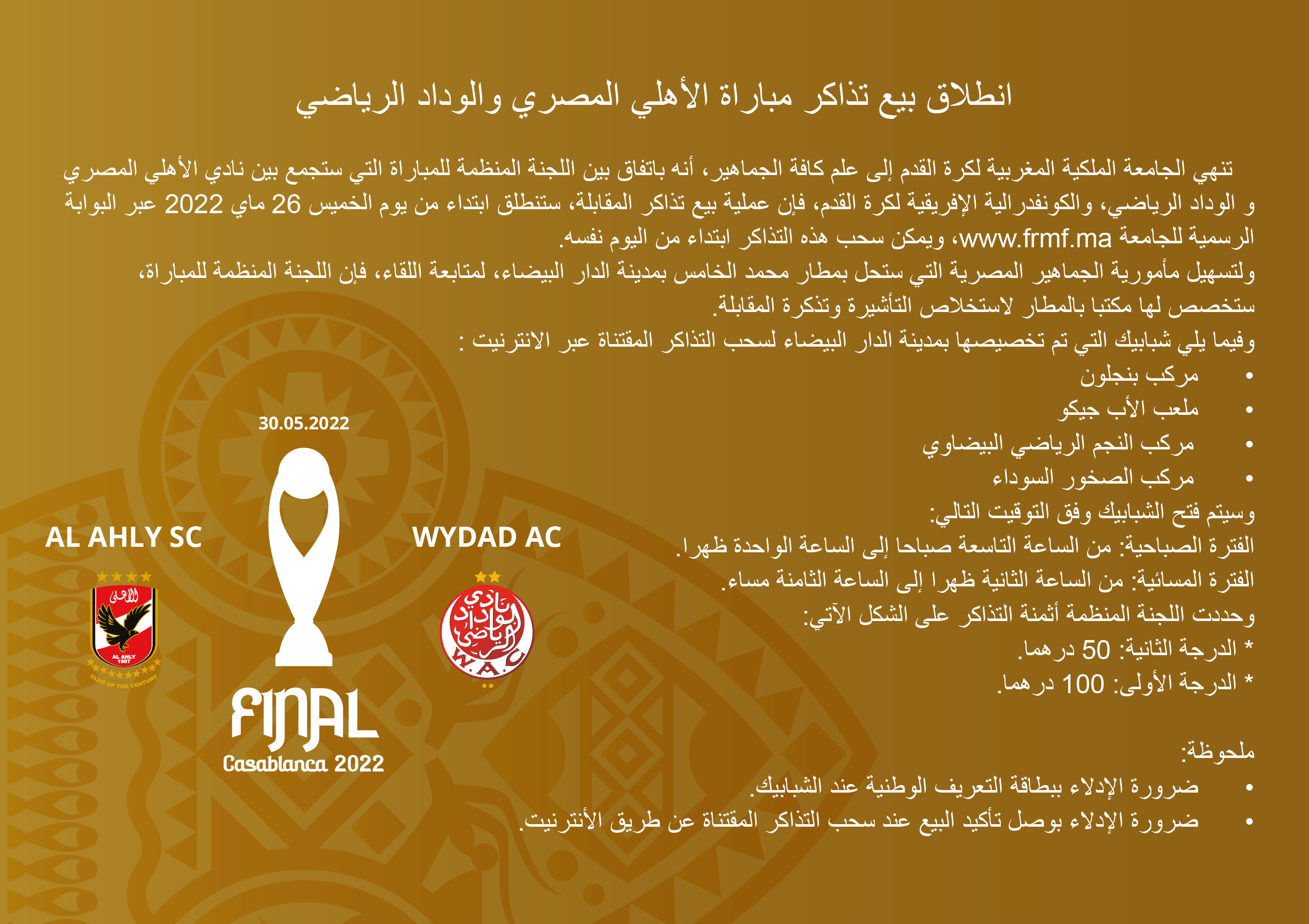 وقالت الجامعة في بلاغ لها » أنه باتفاق بين اللجنة المنظمة للمباراة التي ستجمع بين نادي الوداد الرياضي والأهلي المصري ، والكونفدرالية الإفريقية لكرة القدم، فإن عملية بيع تذاكر المقابلة، ستنطلق ابتداء من يوم الخميس 26 ماي 2022 عبر البوابة الرسمية للجامعة www.frmf.ma، ويمكن سحب هذه التذاكر ابتداء من اليوم نفسه « .
