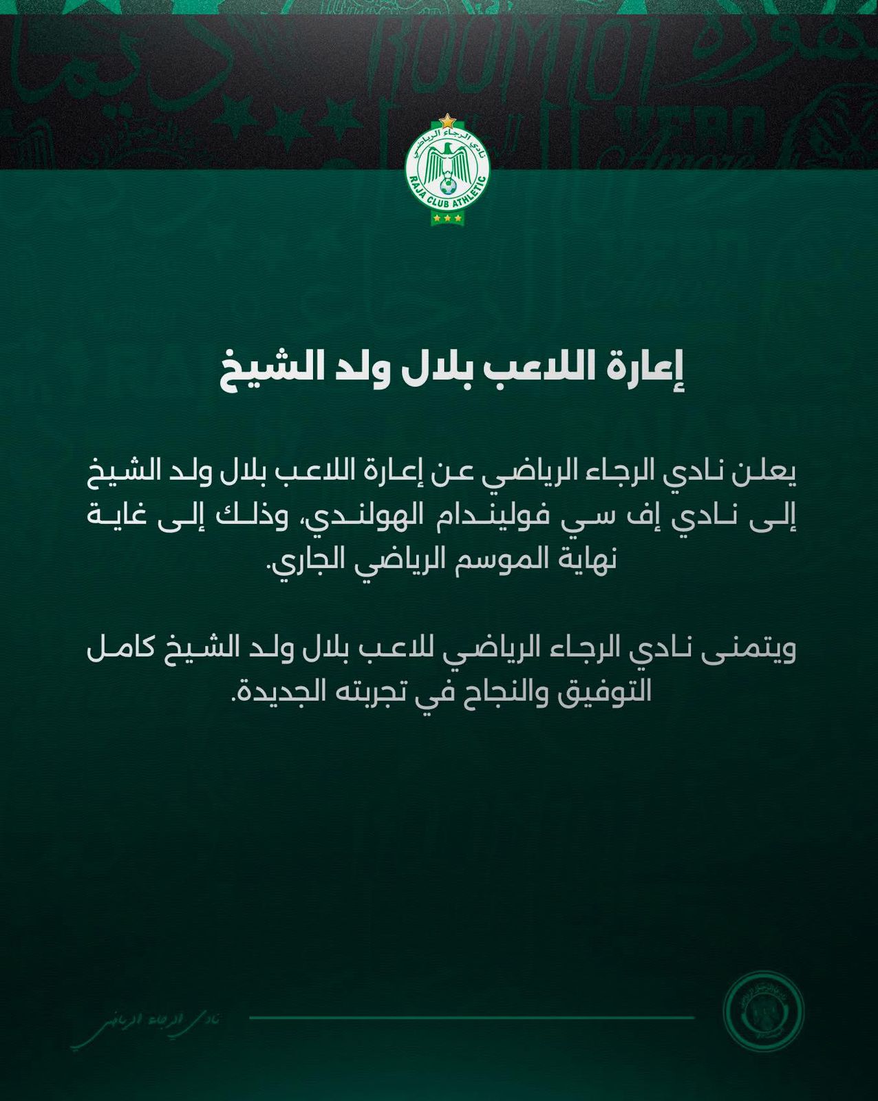 حسم نادي الرجاء الرياضي قراره بخصوص مستقبل لاعبه بلال ولد الشيخ، بعدما أعلن عن انتقاله على سبيل الإعارة إلى نادي إف سي فولندام الهولندي إلى غاية نهاية الموسم الرياضي الجاري، في خطوة تهدف إلى منح اللاعب فرصة أكبر للمشاركة المنتظمة.