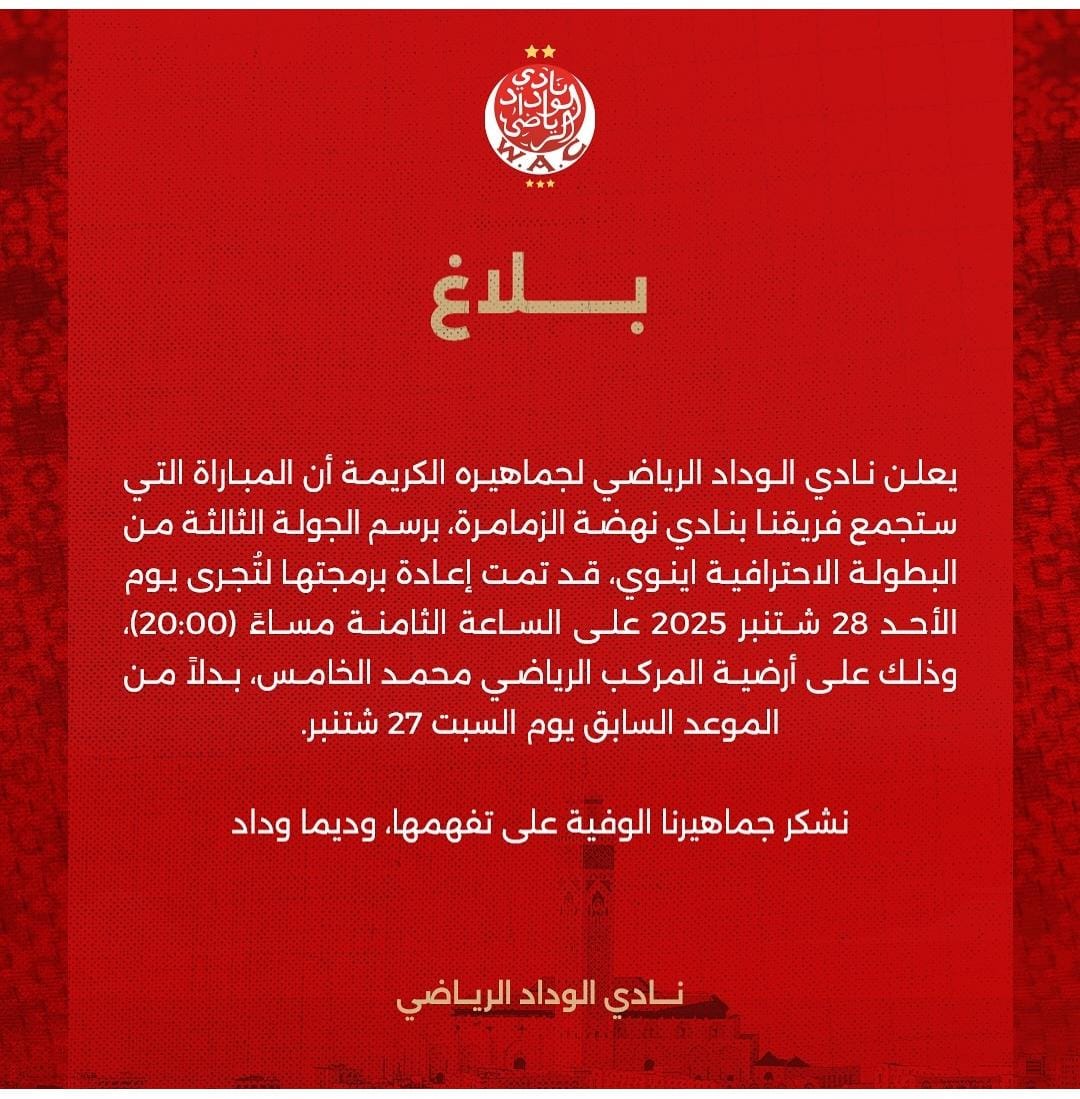 هذا هو الموعد الجديد لمباراة الوداد الرياضي ضد نهضة الزمامرة